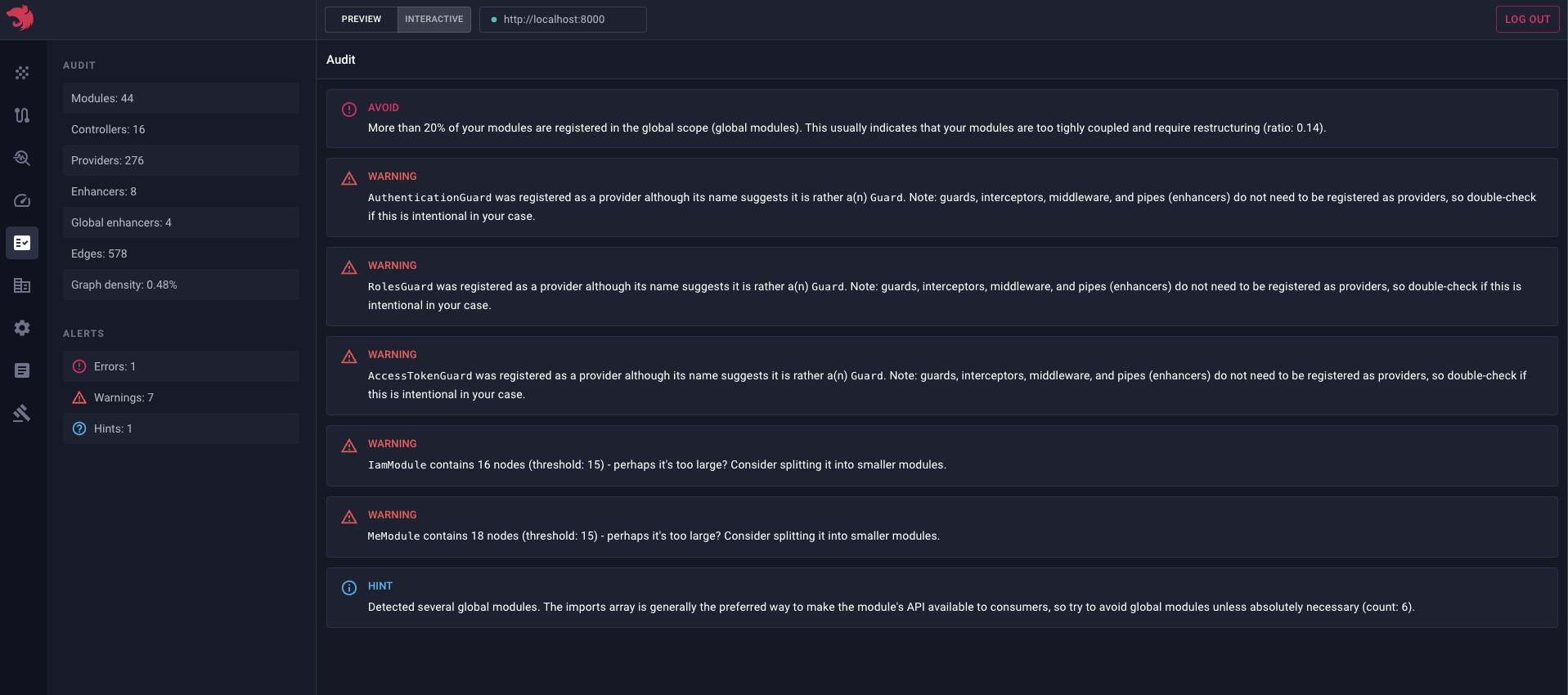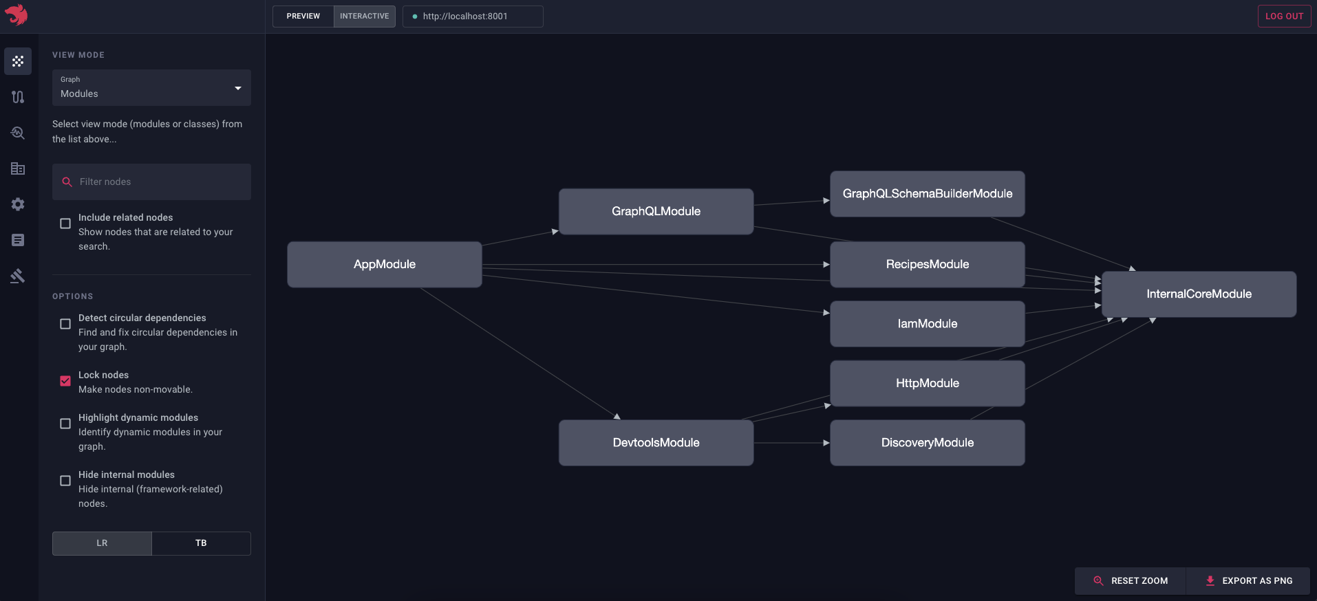 如上方截图所示,每个模块都连接到 InternalCoreModule。InternalCoreModule 是一个始终被导入根模块的全局模块。由于它被注册为全局节点,Nest 会自动在所有模块与 InternalCoreModule 节点之间创建连接边。现在,若要从图中隐藏全局模块,可以使用侧边栏中的" 隐藏全局模块 "复选框。