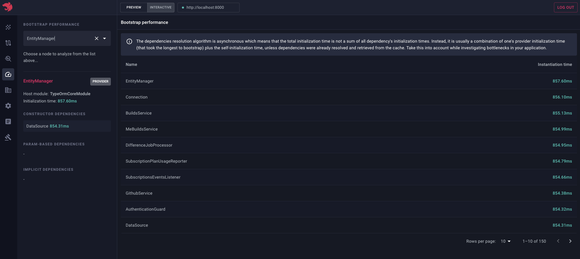 要查看所有类节点(控制器、提供者、增强器等)及其对应实例化时间的列表,请导航至启动性能页面: