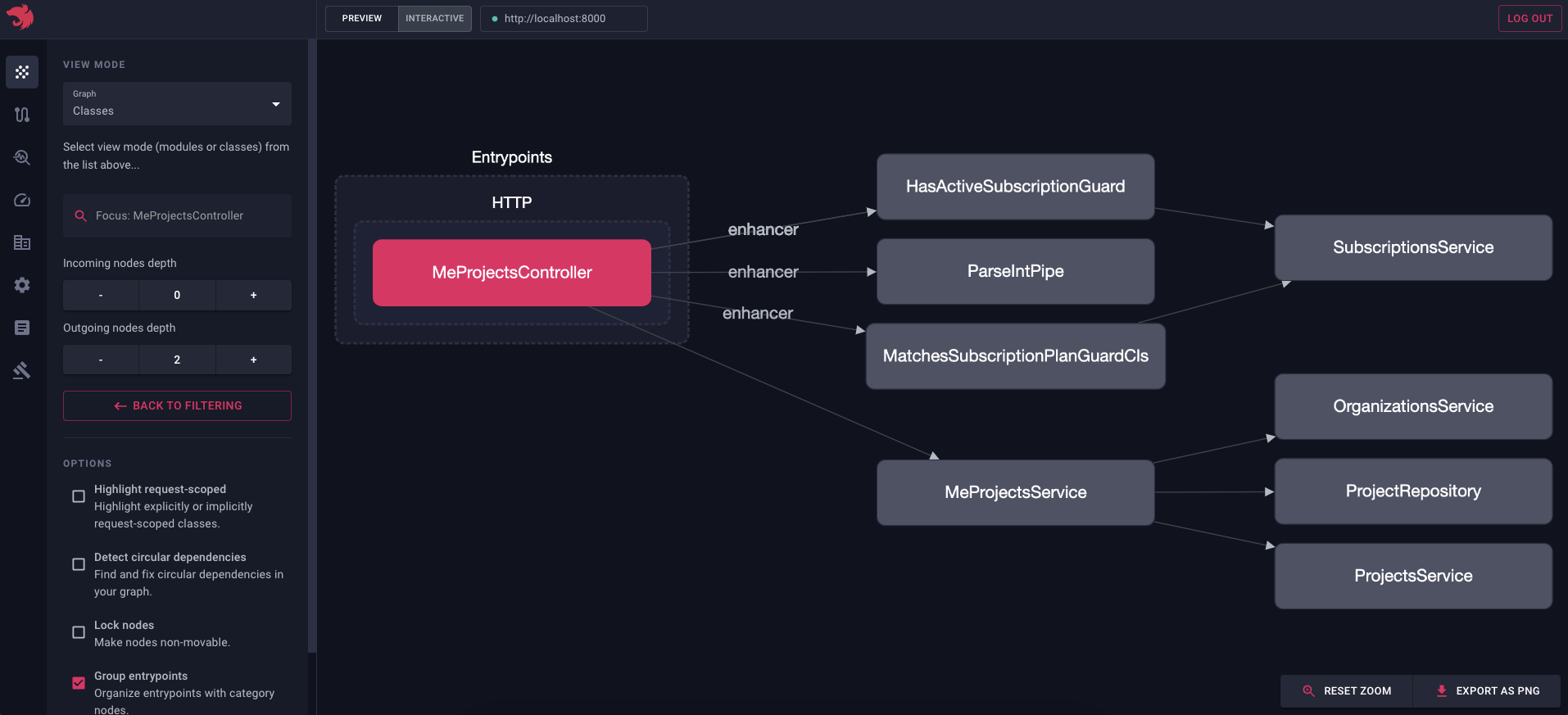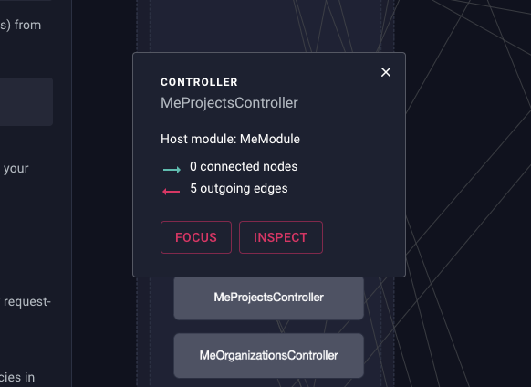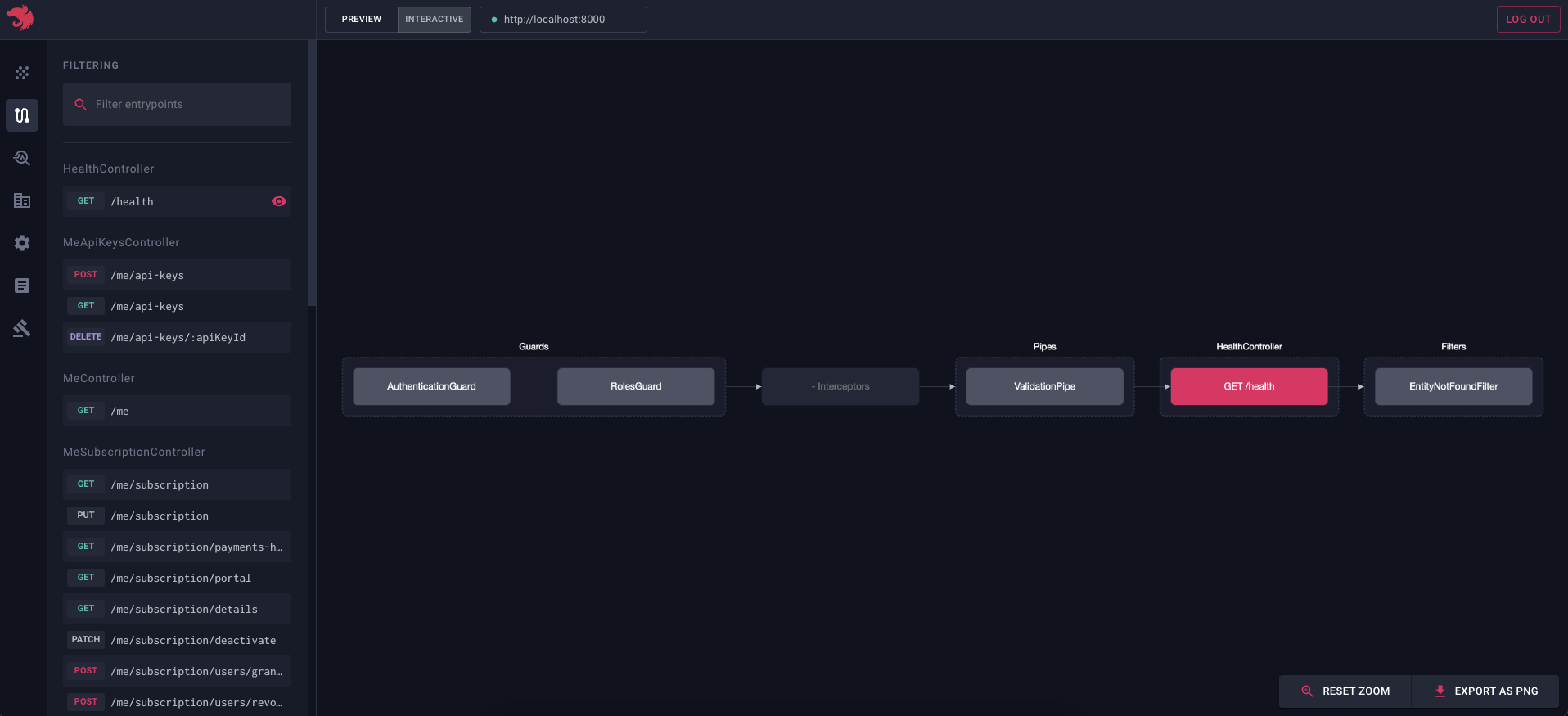 点击特定入口点时, 流程图将会显示。该图展示了入口点的执行流程(例如绑定到该路由的守卫、拦截器、管道等)。这在您需要了解特定路由的请求/响应周期,或排查为何特定守卫/拦截器/管道未执行时尤为有用。