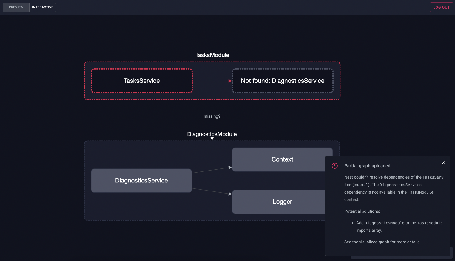 您可能遇到的最常见错误消息是关于 Nest 无法解析提供者依赖项的问题。使用 Nest Devtools,您可以轻松识别问题并学习如何解决它。
