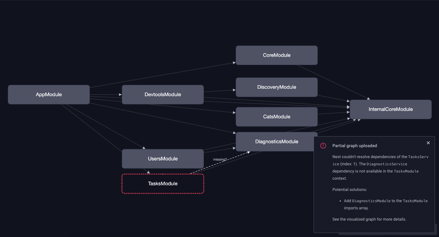 这张图表明我们想要注入到 TasksService 中的 DiagnosticsService 在 TasksModule 模块的上下文中未被找到,我们很可能只需要将 DiagnosticsModule 导入到 TasksModule 模块中即可解决这个问题!